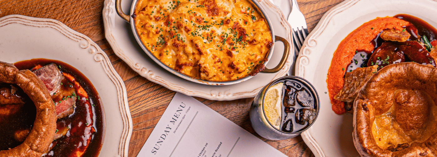 Beautifully cooked meats, crispy roast potatoes, seasonal vegetables and rich gravy with all the classic trimmings.
